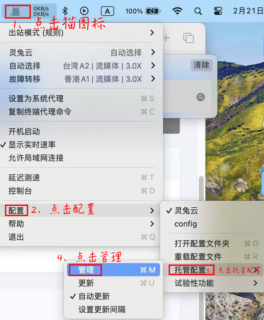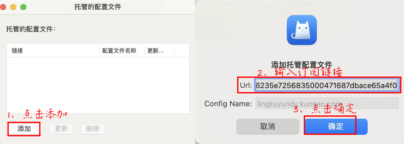 ## 第一步:下载Clash软件 ### [👉 【点击下载安装】👈](https://pan.kunlunfiles.us/OpenSource/Mac/clash-latest.dmg "👉 【点击下载安装】👈")  ### 然后在应用程序中打开ClashX pro软件,打开后桌面右上角上就会有软件的图标  ## 第二步:导入节点到Clash ### 联系客服拿URL订阅链接 ### Clash订阅链接 粘贴到软件里面,打开软件【配置】的【托管配置】的【管理】  ### 1.点添加 ### 2.将复制好的订阅链接粘贴到URL 点确定 ### 3.点更新,就添加成功  ### 1.在出战模式下面选择有数自己的国家 ### 2.设置为系统代理这里打勾✓